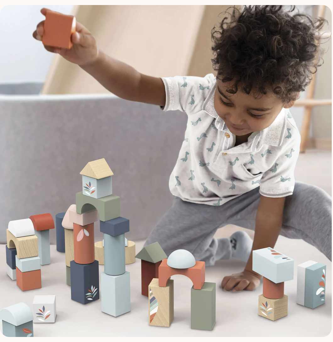 Go to the shopThe building block set containing 50 colourful wooden building blocks for toddlers in a variety of shapes. Perfect for open ended play these blocks are printed with pretty leaf patterns to further encourage imaginative play. The blocks come in a sturdy, round bucket with a handle and shape sorter lid making pack up time much more fun! This toy is crafted from sustainably sourced wood from FSC® certified forests and coated with non-toxic paint.