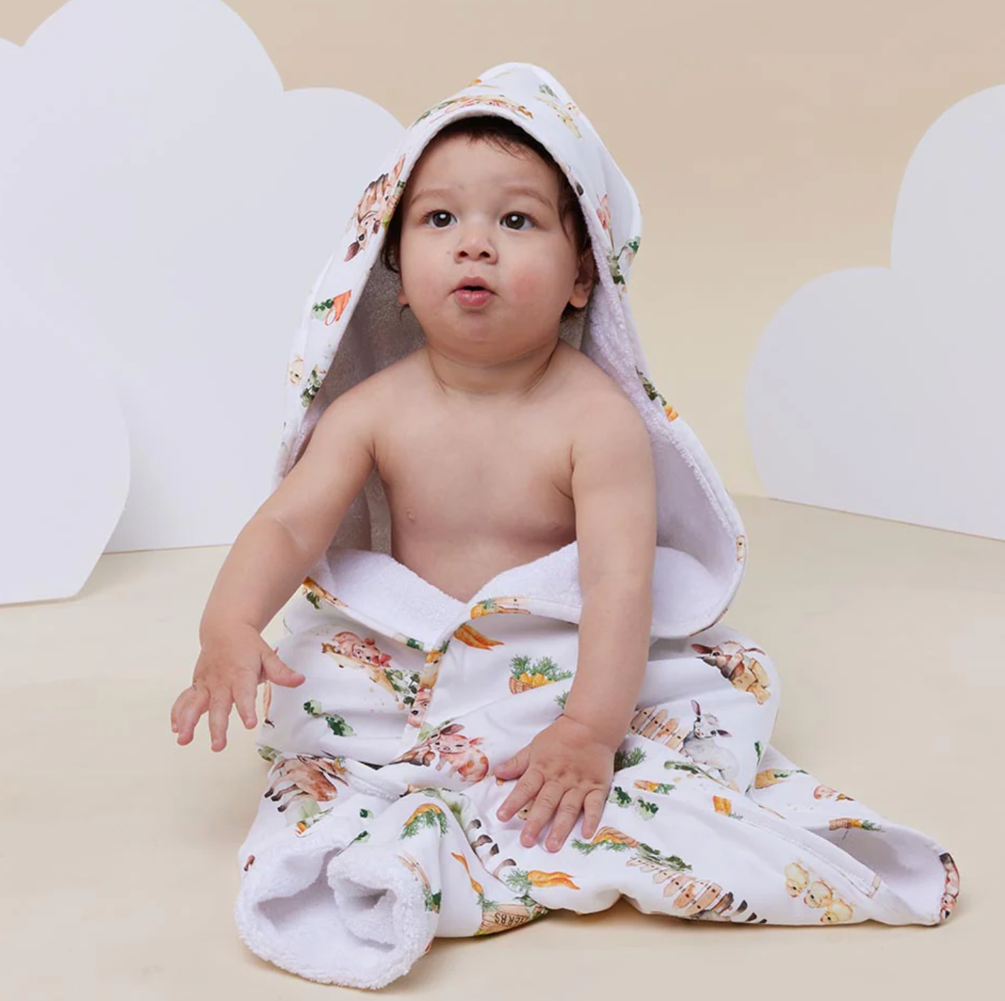 This beautiful extra large organic baby towel in Farm is the perfect size for babies and toddlers and will brighten up any bathroom.